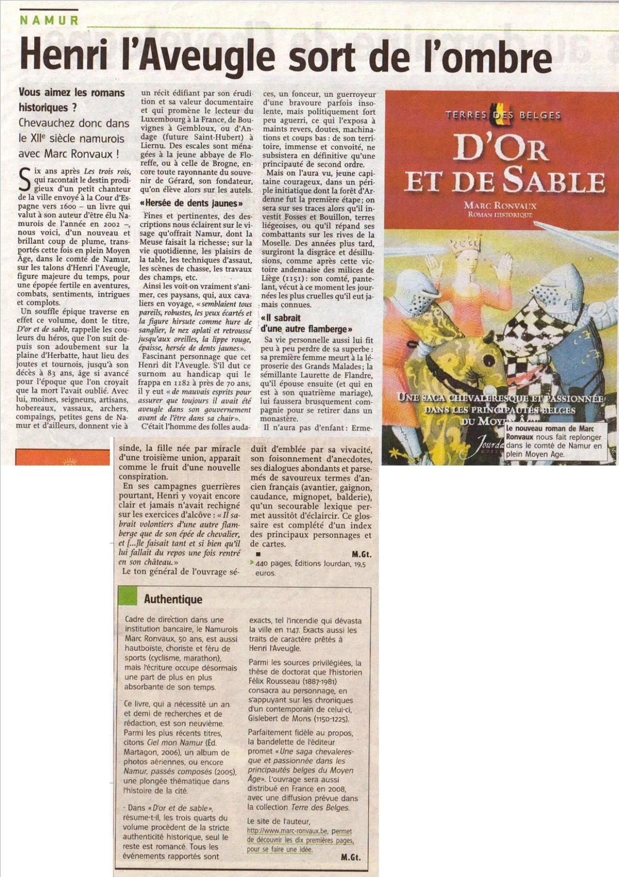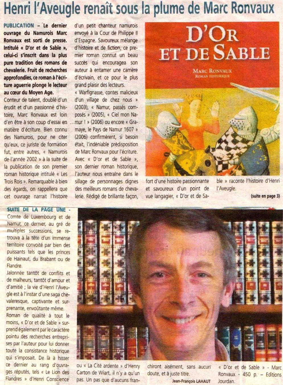 D’Or et de Sable (roman historique)A l'aube du XIIe siècle, Flandre, Hainaut et Brabant se disputent la suprématie de l'ancienne Lotharingie, aux confins du royaume franc et de l'empire germanique. Un nouveau rival leur vient : le jeune Henri, comte de Luxembourg et de Namur, que les hasards des successions mettent à la tête d'un immense territoire.Mêlé d'abord à de terribles secrets de famille, celui que l'Histoire nommera Henri l'Aveugle devra affronter la puissance des princes de l'Eglise, Trèves et Liège. Il va faire face aussi au drame intime qui le poursuivra tout au cours de sa longue vie : celui de sa propre succession.Marc Ronvaux nous attache à cet homme à la fois insupportable et facsinant, qui s'est choisi pour couleurs l'or et le sable. Luttes pour le pouvoir, amours, amitiés, tout bouillonne dans cette saga minutieusement documentée qui nous plonge au coeur du Moyen Age. C'est le temps des croisades et des chevaliers, celui aussi où naît un monde nouveau : les villes s'éveillent, les abbayes fleurissent, la littérature se réinvente.ISBN 978-2-87466-013-9, 2008, format 14x21,5 cm, 450 pages, prix public 19,50 €Editions JourdanDiffusion en Belgique : Jourdan DiffuseurDistribution en Belgique : SDL Caravelle, Bruxelles ; en France : Editour, Saint-Paul-les-Trois-Châteaux ; en Suisse :Albert le Grand, Fribourg ; au Canada : HTM-Hutubise, Montreal.Aussi distribué en Belgique par Editions Martagon, asblLe livre est aussi en vente sur Amazon, FNAC, Desitre, Sauramps, etc.Extraits de presse :